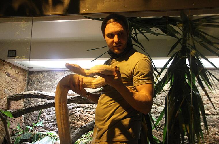Vorsichtig nimmt Tierpfleger Michael Ricker Rudi aus dem Terrarium und hält ihn mit beiden Händen in die Höhe. "Eine der größten Schlangen überhaupt", meint er. Der weiße Python ist dreieinhalb Meter lang und 25 Kilogramm schwer. Er kann Beutetiere mit deutlich höherem Körpergewicht verspeisen, erklärt der Reptilienexperte am Donnerstagabend bei einer Nachtführung.