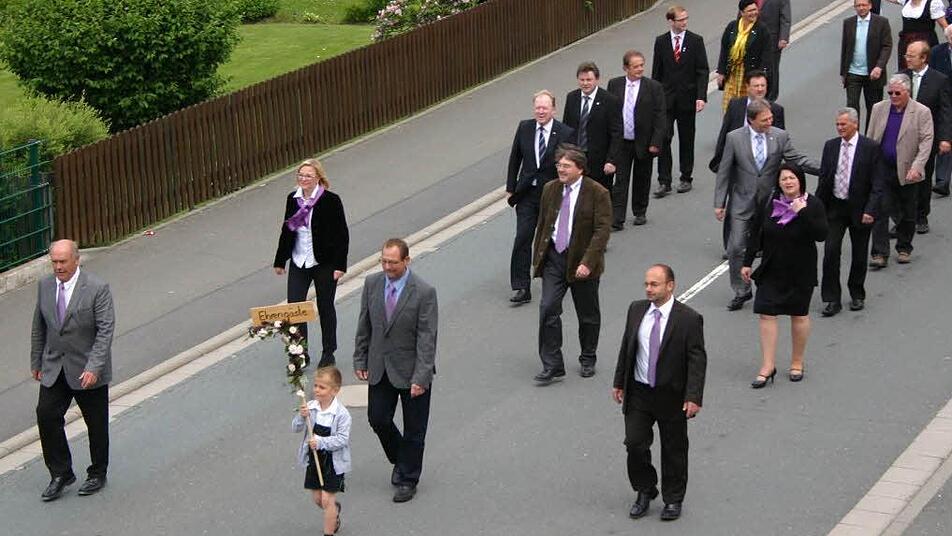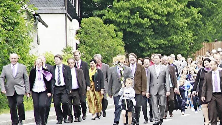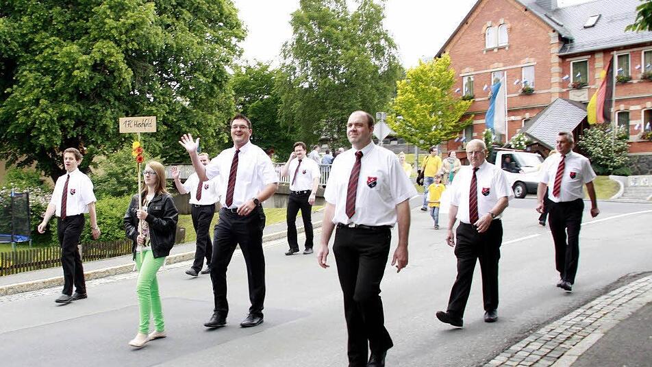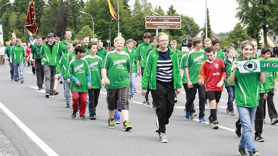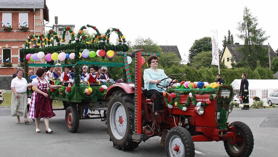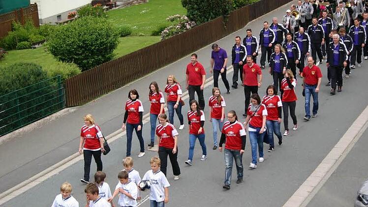 Aus den anderen Steinbacher Gemeindeteilen waren nicht nur Sportvereine gekommen, um den Jubelverein zu unterstützen, sondern auch die Jüngsten, wie die Kindergartenkinder aus Buchbach, die sich im bunt geschmückten Traktoranhänger chauffieren ließen. Pünktlich setzte sich der Festzug, begleitet vom Musikverein Steinbach am Wald, in Bewegung. Angeführt wurde der Zug vom Vorstand des SC Rennsteig zusammen mit dem Schirmherrn Nikolaus Wiegand sowie der Festausschuss-Vorsitzenden Angela Wiegand.