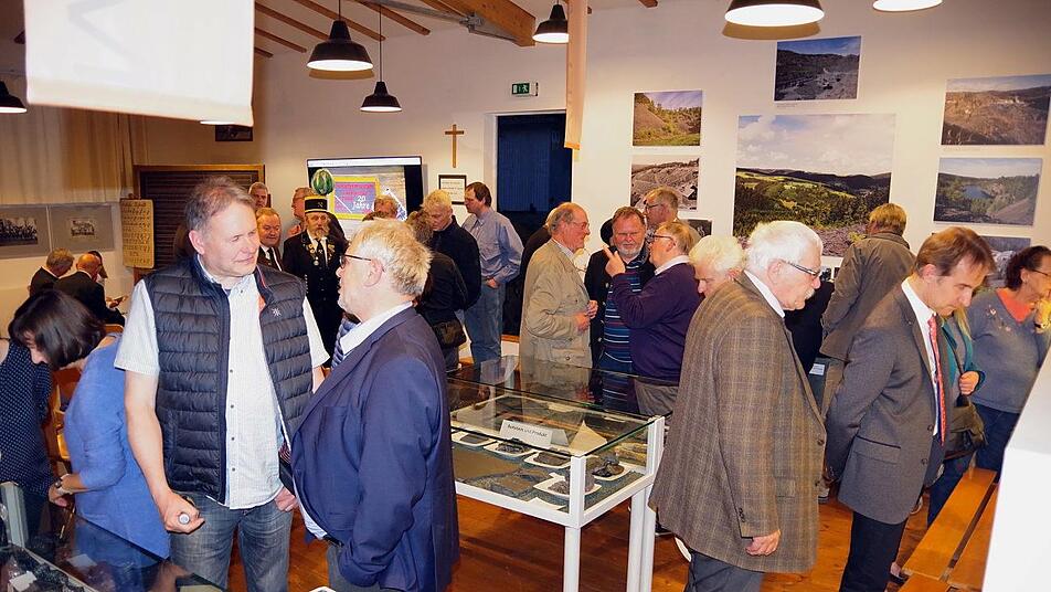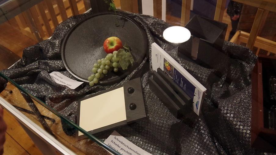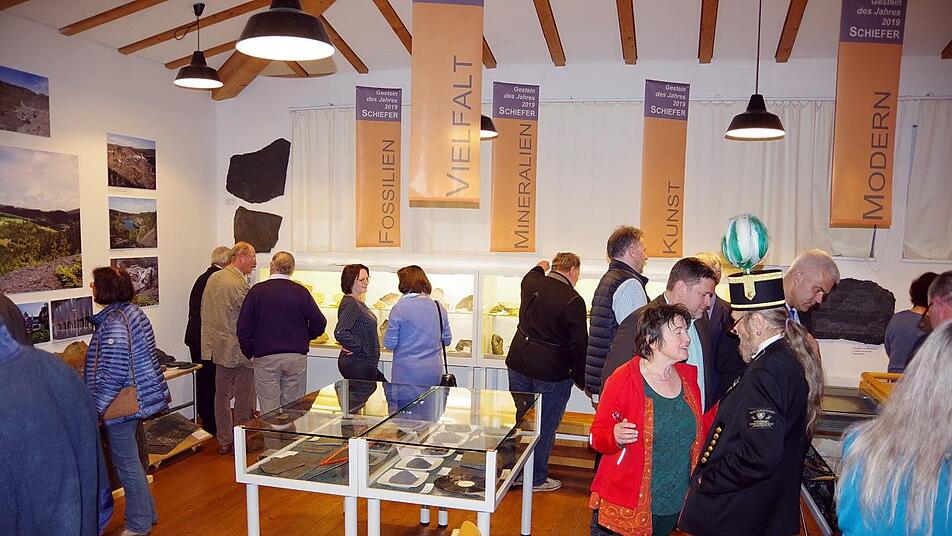 Bei der Feier wurde die neue Sonderausstellung "Schiefer - Ein Wort mit vielen Facetten" eröffnet, in die GHAG-Mitglied Martin Weber einführte. Bilder und Exponate stellen die ganze Vielfalt von Schiefer dar - in einer beeindruckenden Verbindung von Alt und Neu. Dass man mit Schiefer auch neue Wege gehen kann, zeigt beispielsweise eine Musterkollektion der Firma Heinz Glas mit auf Flakon aufgetragenen feinsten Schieferplatten.