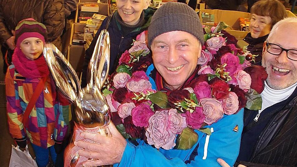 "Den Kranz wollte ich gar nicht, aber der Hase ist ein ganz hochwertiges Stück. Er ist mindestens 60 Euro wert. Das war ein richtiges Schnäppchen", sagt der Leiter der Kronacher Servicestelle des Staatlichen Bauamts Bamberg und freut sich. Er verrät, dass das schöne Deko-Stück einen Ehrenplatz in seinem Wohnzimmer erhält. Woll hat noch ein weiteres Schnäppchen gemacht: Er hält einen Geschenkkorb mit regionalen Markenprodukten unterm Arm. Gerade einmal zwölf Euro habe er dafür bezahlt.