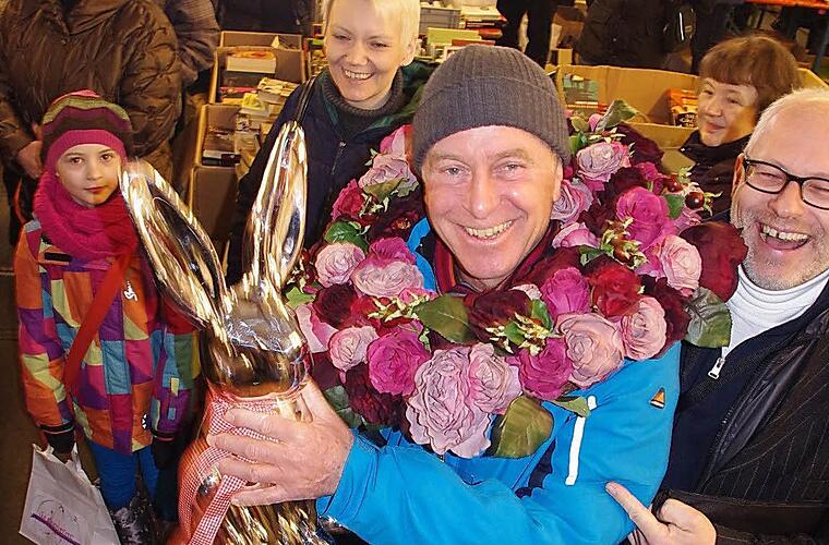 Jürgen Woll lacht. Einer seiner Lions-Freunde hat ihm einen Kranz aus künstlichen Blumen um den Hals gelegt. In der Hand hält er einen großen silbernen Deko-Hasen. Den Blumenkranz und den "Meister Lampe" hat Jürgen Woll gerade zusammen für 20 Euro ersteigert.