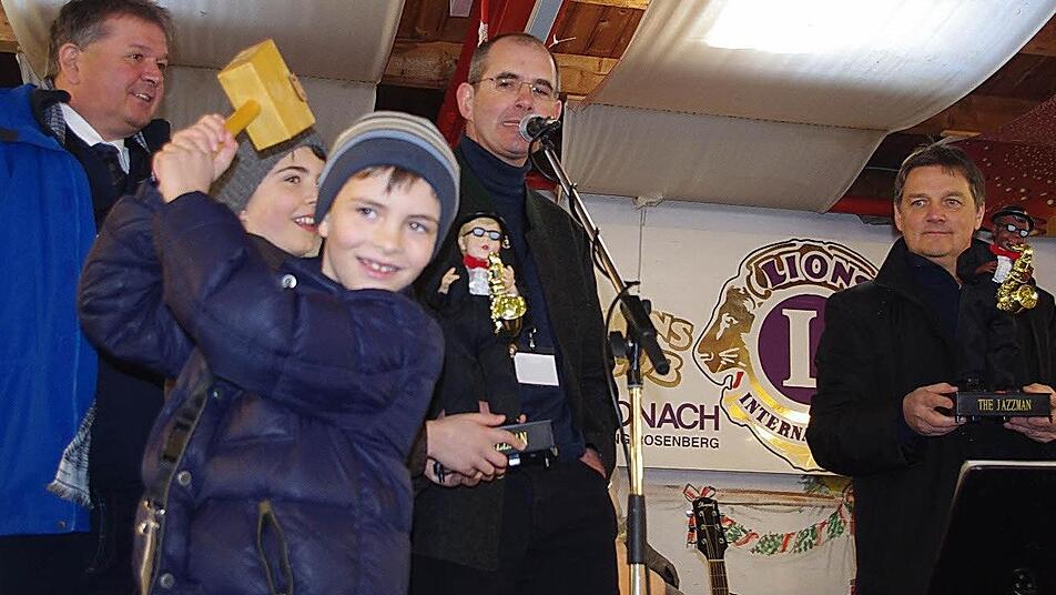 Notar Thomas Reich schlüpfte heuer, bereits im dritten Jahr in Folge, in die Rolle des Auktionators - und das mit ausgesprochen gutem Erfolg. Claus Mark und Lions-Präsident Hans Jürgen Möhrle unterstützen ihn dabei und reichten ihm die Auktionsstücke. Den Hammer schwangen Reichs Söhne, Xaver und Georg.