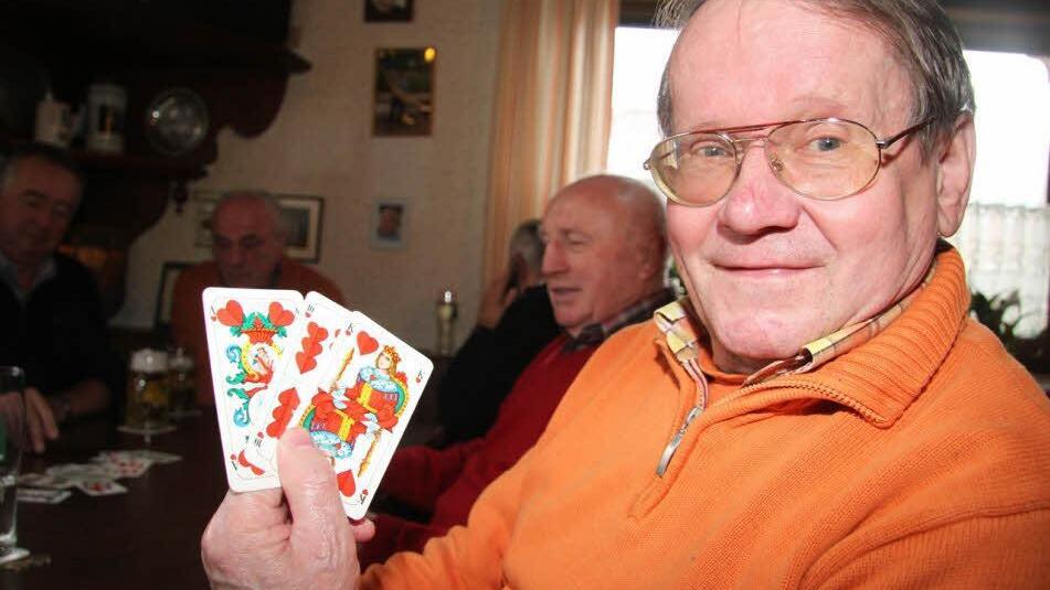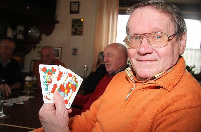 Die Wallenfelser Kartler haben einen festen Einsatz: Gespielt wird um drei mal 50 Cent. "Es geht ja nicht ums Geld, sondern um die Geselligkeit", erklärt Adolf Weiß und schmunzelt. Denn ihm wurden auf Anhieb eine Herz-As, eine Zehn und ein Herz-König in die Hand gegeben, damit hat er das Spiel für sich entschieden und kommt dem Anführer Günther Köhler auf die Spur.
