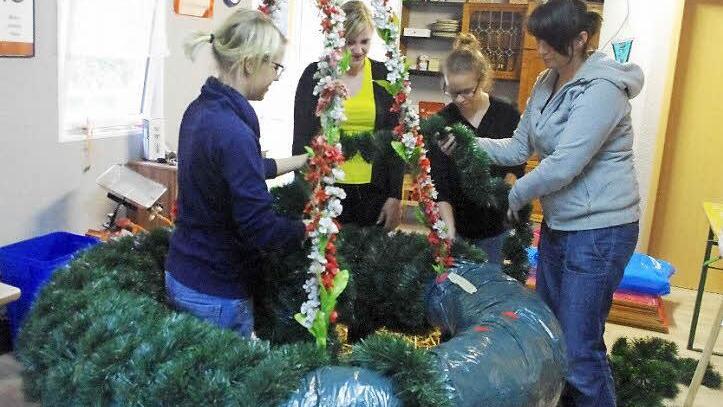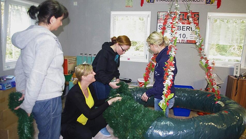 "Schrubberinnen" binden und schmücken den Kranz Während die beiden mit dem Bemalen des Maibaums beschäftigt sind, sind auch die "Schrubberinnen" nicht untätig: Im schmucken "Schrubbe"-Vereinsheim in Tiefenbach binden und schmücken Carina Jakob, Laura Beetz, Simone Porzig, Nicole Gerber und Linda Müller gerade den Kranz des Maibaums.