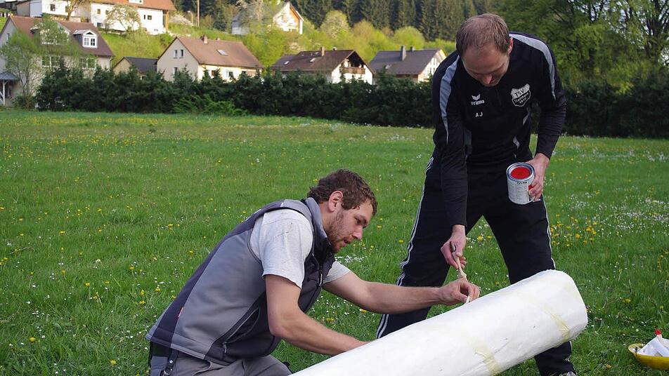 Stolze 20 Meter lang und glatt wie ein "Kinderpopo": Das ist der Steinberger Maibaum, der gar nicht mehr wie ein Baum aussieht, sondern eher wie eine lange Holzstange. Er hat keine Äste und Zweige mehr und wird gerade vom "Ober-Schrubbe" Alexander Jakob und dem Dritten Vorsitzenden Simon Kraus spiralförmig in den Farben Frankens angemalt. Ein nach bayerischer Tradition "richtig" geschnürter (bemalter) Stamm hat die Spirale von unten links nach oben rechts gedreht. Wir haben den tüchtigen "Schrubbern" bei ihrer Arbeit etwas näher über die Schulter geschaut und das Unternehmen "Steinberger Maibaum 2014" unter die Lupe genommen.