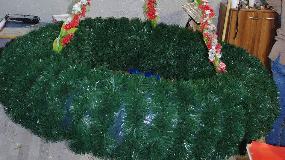 Der Eisenring wird erst mit Stroh, dann mit Klarsichtfolie und blauen Müllsäcken umwickelt. Darum binden sie künstliches Tannengrün, das ihnen von der Theatergruppe Steinberg überlassen wurde. Es handelt sich dabei um den Schmuck der alten, von der Theatergruppe Steinberg gestalteten, Osterkrone auf dem Dorfbrunnen. Gehalten wird der Kranz von Blütenranken in den fränkischen Farben.