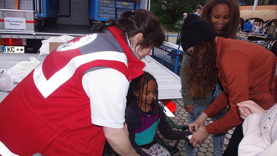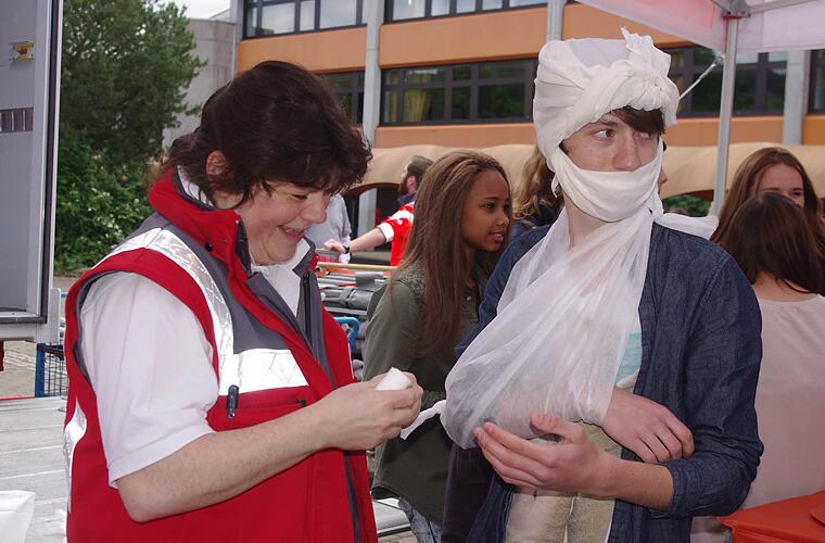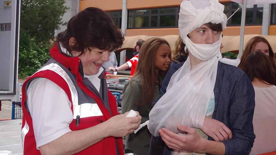 Zum Glück kann der Schüler noch lachen: Er hat keine echte Wunde, sondern fungiert - sehr zur Freude seiner Mitschüler - an diesem sonnigen Nachmittag als "Anschauungsobjekt" für Erste Hilfe-Maßnahmen, wie sie gerade einige Mitarbeiter des BRK-Kreisverbandes auf dem Außengelände des Kronacher Schulzentrums demonstrieren.