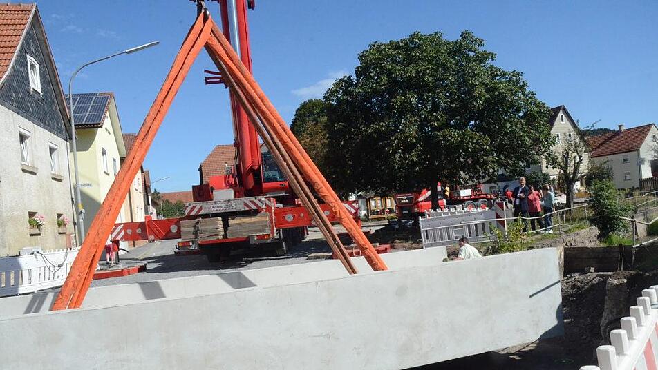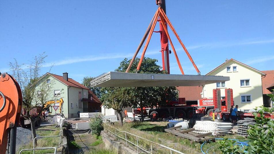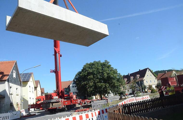 Trotz der enormen Gewichte und Ausmaße wurden die Fertigteile zentimetergenau vom Kran mehrere Meter durch die Luft transportiert und abgesetzt. Von den interessiert beobachtenden Bürgern gab es spontanen Beifall für die gelungene Aktion. Die Fertigbetonteile wurden von einer Firma aus Sennfeld bei Schweinfurt angeliefert. Die Dorfstraße soll in einigen Wochen für Fahrzeuge freigegeben und befahrbar sein.