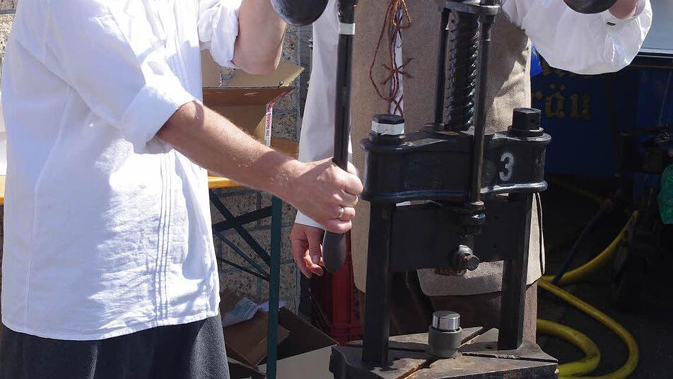 Ausprägungen in Silber sowie Gold gibt es auf Anfragen, während Fritz Kempf und Timo Stadelmann direkt vor Ort an einer Münzpresse Zinn-Medaillen herstellen.