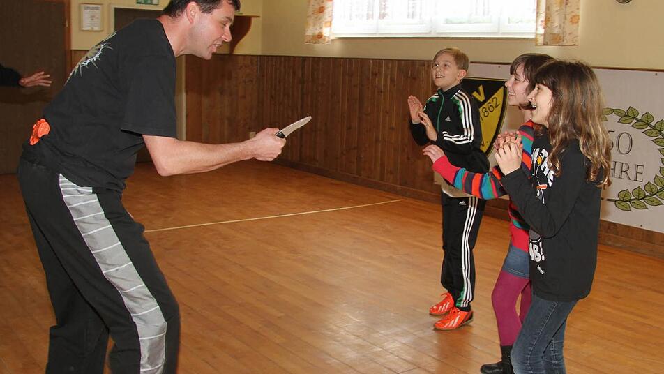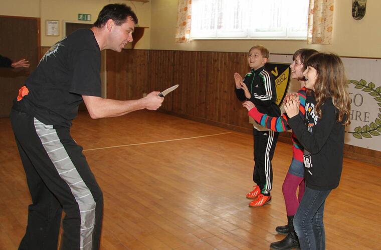 Ganz schön zur Sache geht es bei den praktischen Übungen "Ich bringe euch alle um", schreit Trainer Stefan Luthardt und fuchtelt mit einem Messer vor den Kindern herum. Die rennen weg und schreien laut.