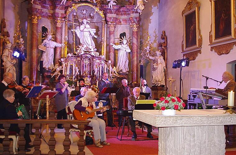 Schöne Stimmen Das Dargebotene war stimmungsvoll, aber nie kitschig und - verglichen mit so mancher weihnachtlichen Retortenmusik - etwas ganz Besonderes. Die schöne Musik zog einen hinein in eine einzigartige Winterwelt, in der man staunend umherwanderte und nicht in den Alltag zurückwollte. Das Gotteshaus mit seiner ausgezeichnete Akustik brachte die schönen Stimmen der Mitwirkenden gut zur Entfaltung. Natürlich war auch wieder das "junggebliebendste" Bandmitglied und "Juwel" des Ensembles mit von der Partie - Ursula Keil spielt Gitarre und Mundharmonika und feiert im kommenden Februar ihren 93.