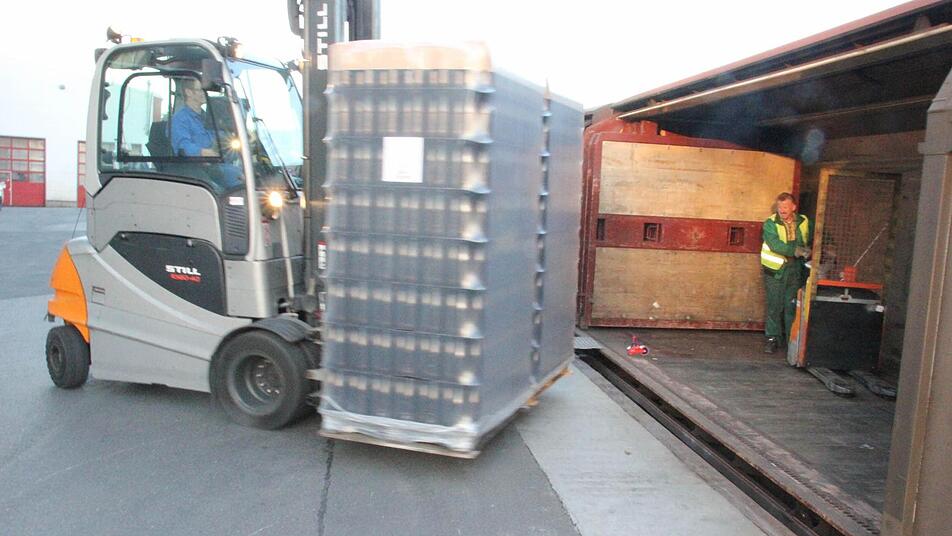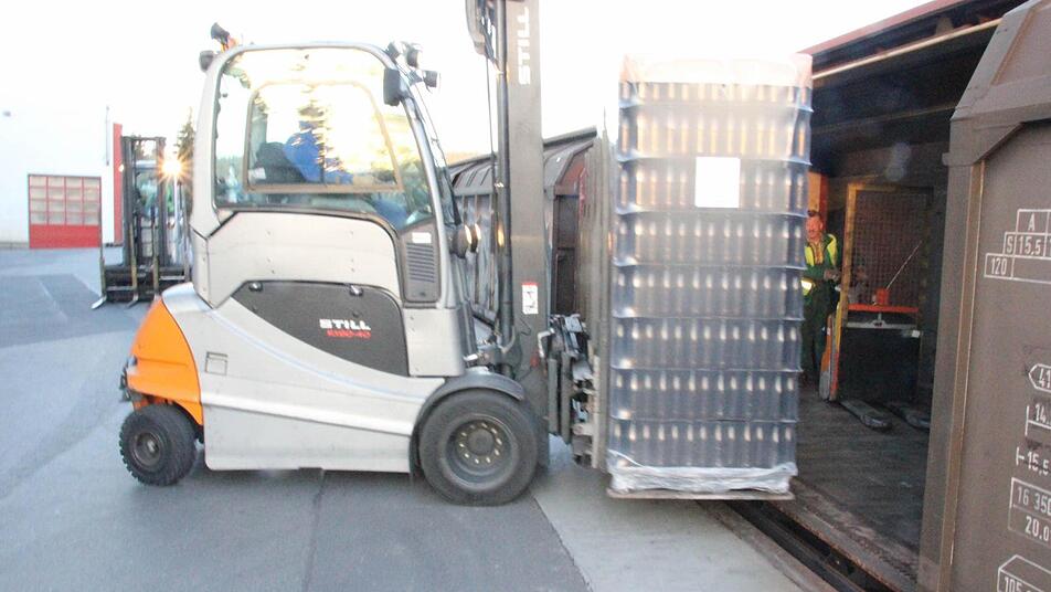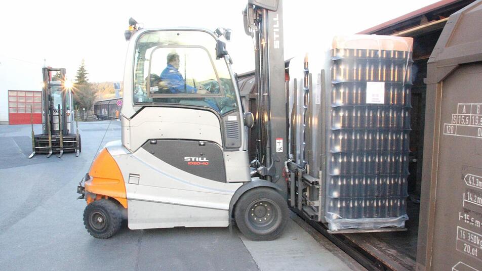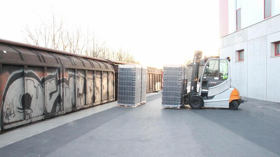 Und wieder rollen die großen Gabelstapler mit jeweils zwei Paletten Glasflaschen aus der Halle zum Beladegleis, verstauen die Fracht in Eisenbahnwaggons. In wenigen Minuten ist ein Waggon voll, 26 Paletten sind drin, so viel, wie ein Lastzug transportieren könnte. Der nächste von insgesamt 41 Waggons wird befüllt.