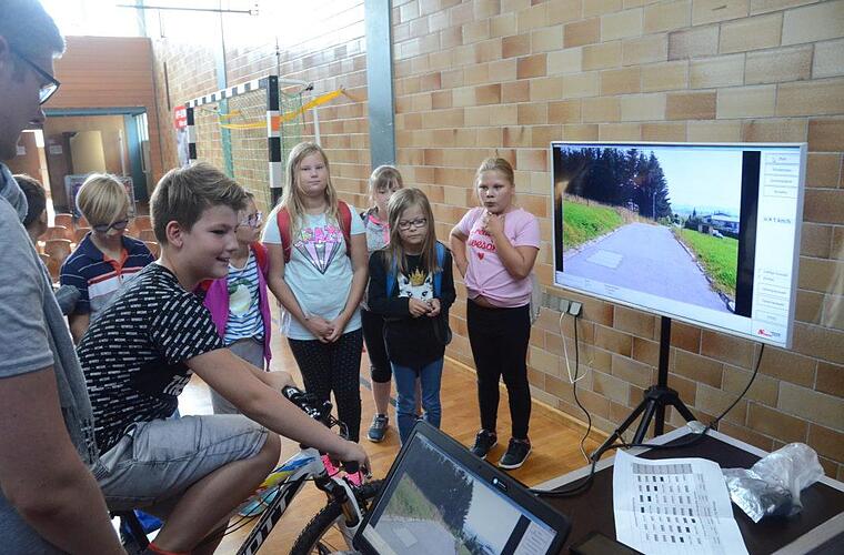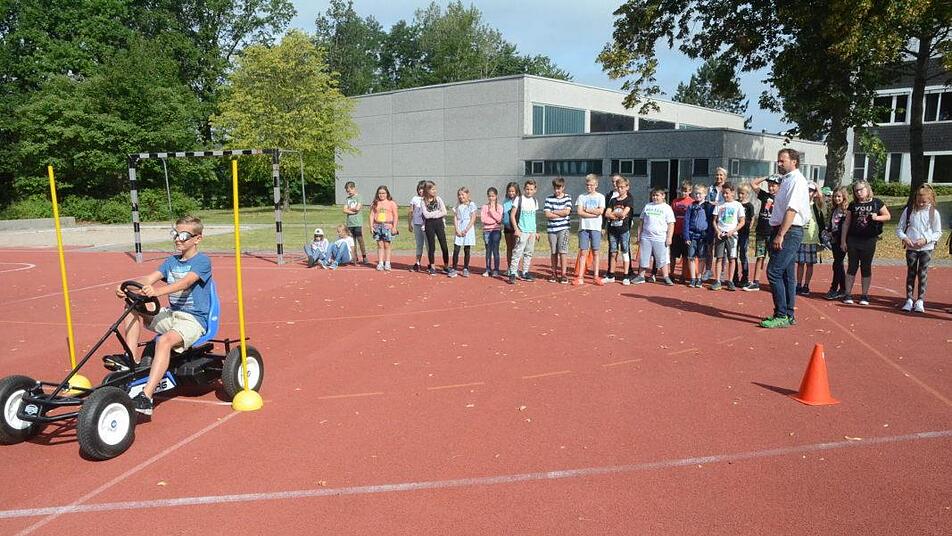 Siegbert Jakob führte die Schüler dann zu ihren sieben Stationen, an denen sie diverse Aufgaben lösen mussten. Das Hauptaugenmerk lag natürlich auf den Gefahren, die bei der Nutzung des Smartphones im Straßenverkehr auftreten können. Dazu gehörte ein Fahrradsimulator, ein Kettcarparcours, ein Laufparcours, Hören (dazu waren Kopfhörer, CD-Player, Handy sowie Beamer und Laptop als Hilfsmittel aufgebaut), Filme zeigten die Gefahren der Handynutzung im Straßenverkehr. Ein Reaktionstest zeigte, dass bei geringster Ablenkung schon eine Reaktionsverzögerung eintritt. Der tote Winkel wurde als lebensgefährliche Falle vorgeführt, Erste Hilfe mit dem BRK wurde vermittelt und anhand von Rollenspielen richtige Verhaltensweisen als "Zivilcourage" mit der Bundespolizei eingeübt. Alle Ehrengäste gaben sich beeindruckt von den guten Vorbereitungen, die sehr arbeitsreich, aber auch sehr effektiv waren.