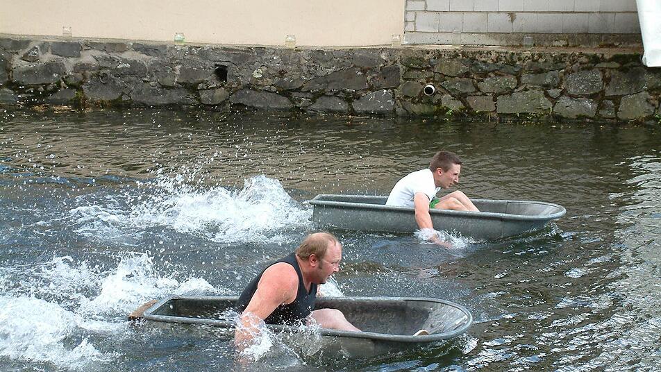Doch so mancher Teilnehmer musste schon auf halber Strecke kapitulieren, denn er hatte nicht die richtige Methode gewählt und ging mit seinem blechernen Gefährt im wahrsten Sinne des Wortes baden. Für die Zuschauer waren derartige Missgeschicke immer wieder Grund, sich an den "Wasserspielen" von Steinwiesen, zu denen auch Floßrennen, Fischerstechen und Tauziehen auf dem Floß gehörten, zu erheitern.