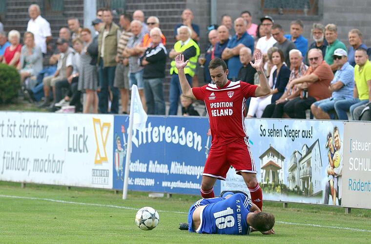 Im Hinspiel kamen der FC Mitwitz und Tobias Gentzsch (blaues Trikot) mit 5:1 beim TSV Mönchröden um Jannik Späth unter die Räder. Foto: Timo Geldner
