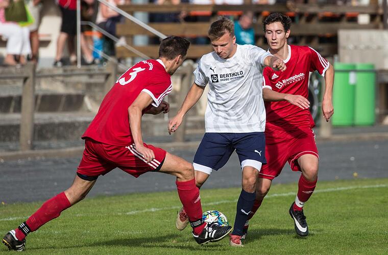 Zwischen den beiden Weißenbrunnern Sebastian Buckreuss und Jonas Wich (rote Trikots, v.l.) sucht der Obermainer Dominique Pinter eine Lücke, um den Ball abspielen zu können. Foto: Heinrich Weiß