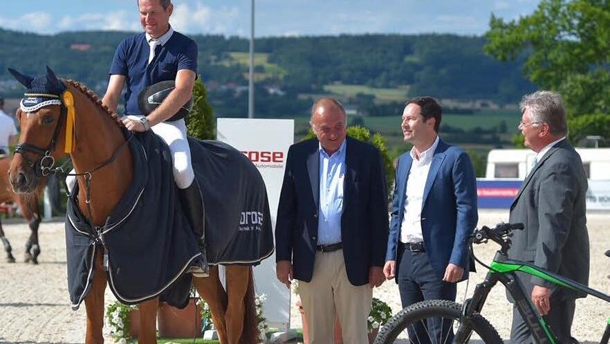 Als erster ging Lokalmatador Hans-Peter Konle auf seiner in Küps gezogenen Stute Queensberry an den Start. Er ging volles Risiko und holte nur so die Sekunden rein, doch unterliefen dem Paar dabei drei Abwürfe. Titelverteidiger Hans-Günther Goskowitz ging es nicht weniger rasant an, auch ihm gelang eine schnelle Runde. Sein Vorteil: Er blieb fehlerlos und holte sich zum zweiten Mal in Folge die goldene Schleife und damit auch das hochwertige E-Bike als Ehrenpreis. Dahinter platzierten sich Sebastian Elias vom RSC Dredesen-Bühlau und überraschend die junge Amazone Antonia Müller vom RSG Frankenhof-Sonnefeld mit Lennox.