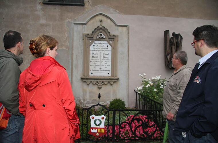 Die Route über den Kronacher Friedhof führte am Marienbrunnen, der erst 1923 an seine heutige Stelle versetzt wurde, vorbei an stark verwitterte Steine, die ebenfalls Geschichte lebendig werden ließen: Da thronte ein Helm auf dem Grab eines Kommandanten, die Inschriften sind schon stark verwittert. Manchmal wird Persönliches preis gegeben - beispielsweise, dass zwei Töchter trauerten. Eine schlichte schwarze Säule erinnert an einen Bezirksgeometer. Und einen besonderen Stellenwert nehmen auch Lehrergräber ein. Denn Lehrer galten noch im vorigen Jahrhundert als herausragende Persönlichkeiten, die sich für das Gemeinwohl engagiert haben und im Licht der Öffentlichkeit standen.