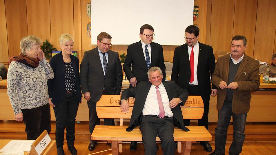 Die "Kreistagsfamilie" trat in Gestalt ihrer Führungsfiguren dann auch gemeinsam in Aktion und trug "Oswalds Ruhebänkla" in den Sitzungssaal. Der Landrat war hellauf begeistert, nahm darauf genüsslich Platz und kündigte an, dass diese rustikale Ruhebank einen Ehrenplatz erhalten werde.