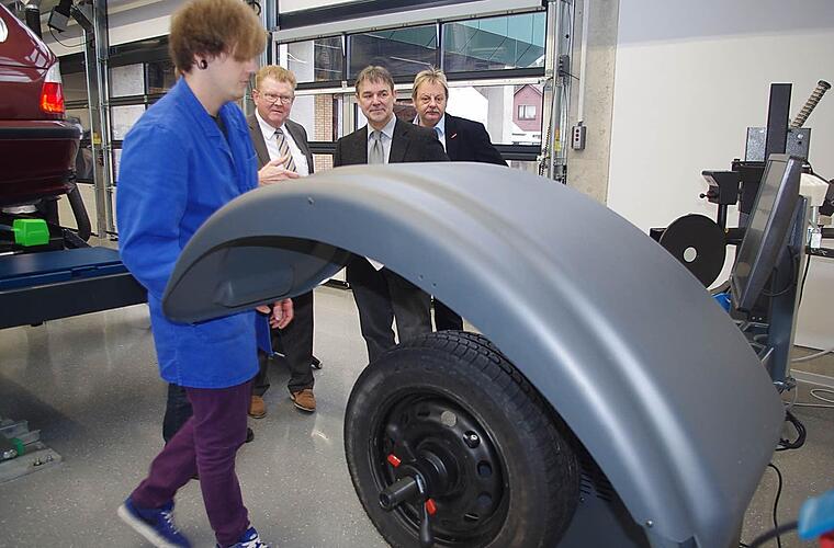 Stellvertretender Schulleiter Werner Zahner, Ideengeber und Planer der Kfz-Werkstatt, stellte die hochwertige technische Ausstattung vor. Darin finden sich beispielsweise eine Absauganlage, drei Hebebühnen - davon eine mit einem Achsmess-Stand, eine Reifenmontier- sowie eine Reifenwuchtmaschine. Es gibt auch einen Bremsenprüfstand und einen CAN-Stand. Seitens der Berufsschule werde viel Wert auf die Langlebigkeit der Bauteile gelegt. Aber auch das didaktische Lernen sei wichtig. Die Schüler sollten wissen, wofür sie lernen.