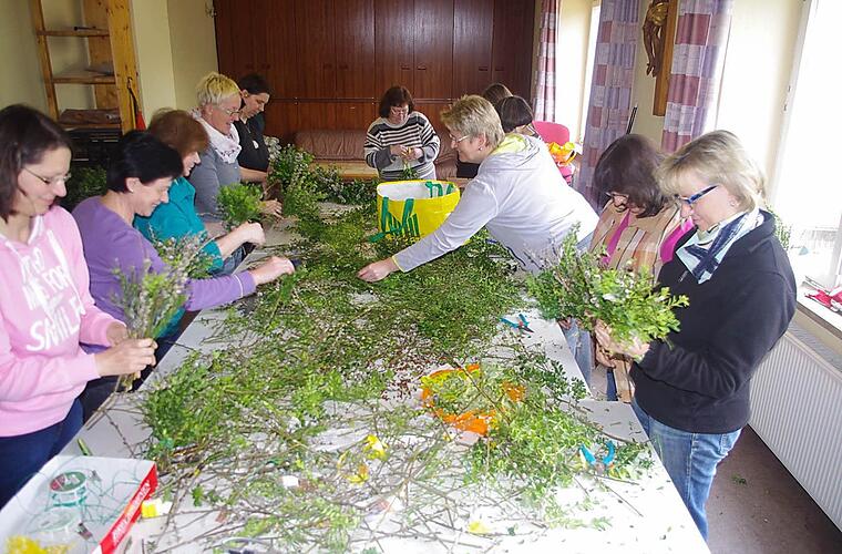 Ganze Berge an Palmkätzchen, Buchs, Heidelbeerzweigen und Osterglocken liegen auf aneinandergestellten Tischen im Steinberger Jugendheim. Elf tüchtige Frauen stehen darum herum. Die Arbeit geht ihnen an diesem Samstagnachmittag flink von der Hand. Sie nehmen jeweils eine Osterglocke und ordnen sie sorgsam mit den Palmkätzchen und dem Grün an. Die Stiele werden gekürzt. Anschließend umwickeln sie die Sträuße mit einem Band und binden sie damit fest zusammen.
