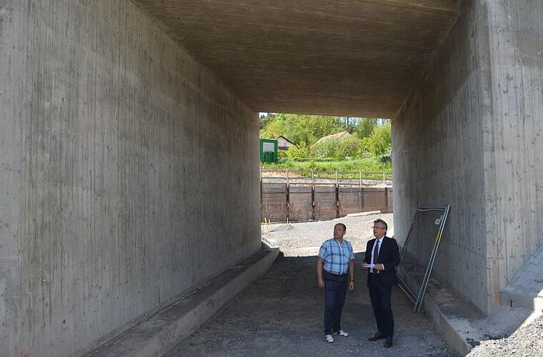 Bei einem Ortstermin mit Bauamtsleiter Günter Hempfling (Gemeinde Stockheim) informiert Bürgermeister Detsch ausführlich über das Problem. Das Problem liegt etwa zehn Meter nach der Unterführung von der B 85 kommend. Die Bahnüberführung ist längst fertiggestellt. Doch jetzt geht es um Streitigkeiten im Straßenbau.