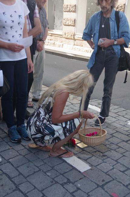 "Hier wohnte Ludwig Mosbacher Jg. 1874 deportiert 1942 Krasnystaw ermordet" und "Hier wohnte Luise Mosbacher geb. Kamm Jg. 1876 deportiert 1942 Krasnystaw ermordet": Während in der Bahnhofstraße 13 ein Auto nach dem anderen vorbeirollt, tragen die Elftklässlerinnen Alexandra und Anna die Vita des von den Nationalsozialisten ermordeten Ehepaars vor. Einige Male müssen die beiden unterbrechen, da ihre Worte im Straßenverkehr untergehen. Unbeeindruckt von alledem verlegt Gunter Demnig, auf dem Boden kniend, die beiden Stolpersteine.