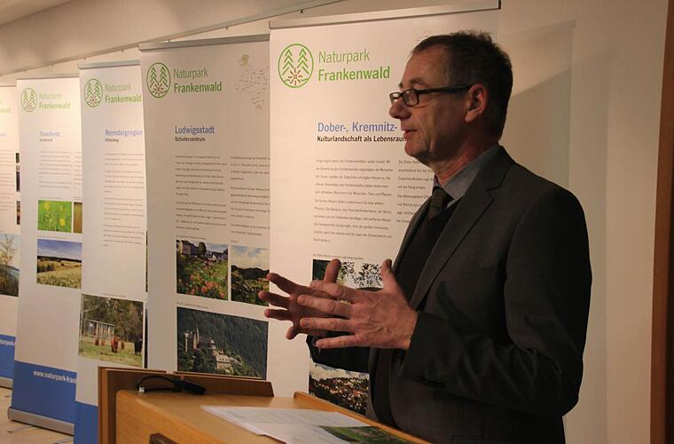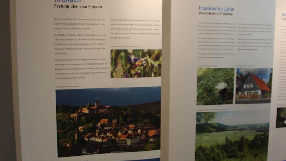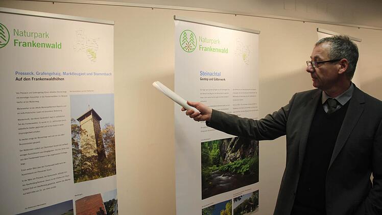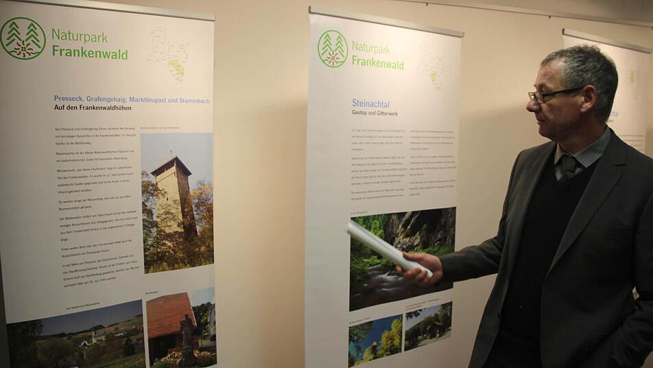 Auf 22 so genannten Rollups, das sind einer Leinwand ähnliche bedruckte Schaubilder, die sich in kleine Kästen einrollen lassen, werden die Regionen des Naturparks Frankenwald vorgestellt. Klar, das Rodachtal, Teuschnitz, Stockheim oder Mitwitz kennen die Kreis Kronacher schon, aber was ist mit dem Höllental? Oder dem Selbitztal? Oder der Schiefen Ebene? Da hat doch mancher Nachhol- und Informationsbedarf, meint Dietrich Förster, Leiter der Ökologischen Bildungsstätte Mitwitz und Geschäftsführer des Naturparks Frankenwald - und deshalb ist er auf die Idee gekommen, die Wanderausstellung auf die Reise zu schicken.