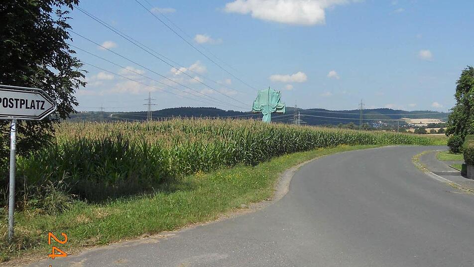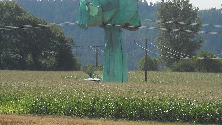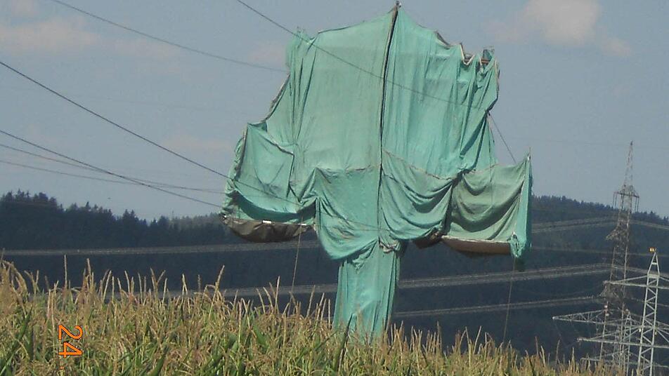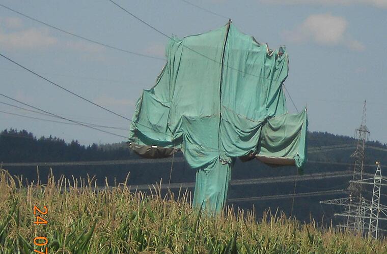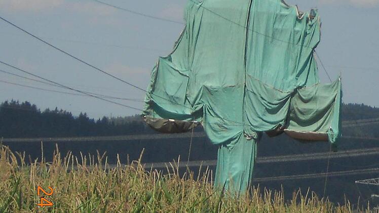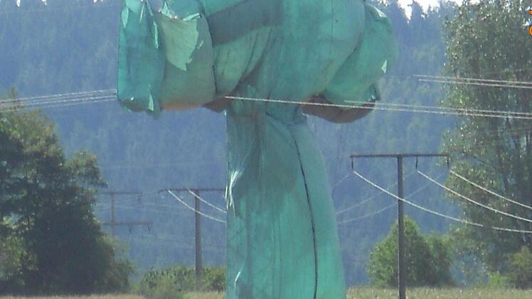Unsere Leser dachten zuerst an den Verpackungskünstler Christo, als sie den in grüne Planen gehüllten Starkstrommast bei Glosberg sahen. Der Künstler war jedoch nicht im Frankenwald - es handelte sich lediglich um eine Instandhaltungsmaßnahme des Bayernwerks.