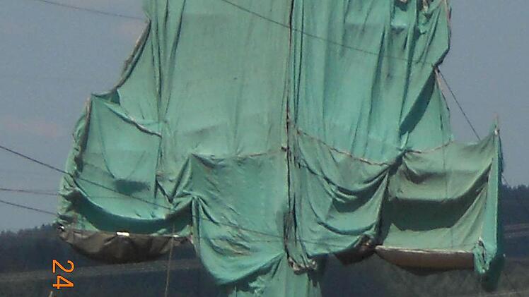 Bei der Verhüllung à la Christo handelt es sich um eine Instandhaltungsmaßnahme des Bayernwerks. Einige der insgesamt 26 Masten der 110-kV-Leitung zwischen Friesen und Stockheim erhalten einen neuen Anstrich. Im Lauf der Jahrzehnte wurden mehrere Farbschichten auf die Stahlgitter-Giganten gepinselt. Die müssen jetzt runter. Dazu wird Druckluft benutzt.