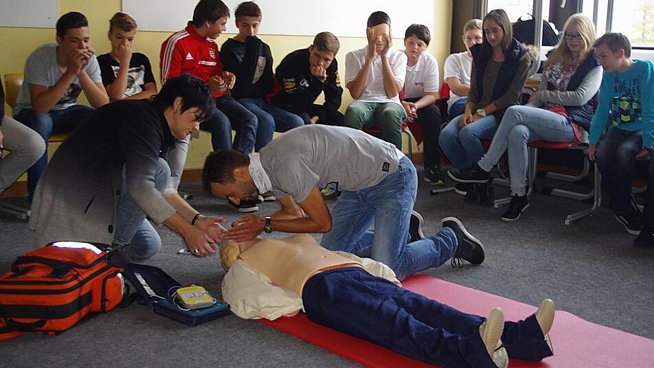 schließlich dann selbst Hand anlegten - und das war durchaus wörtlich zu verstehen, denn eine Herz-Lungen-Wiederbelebung ist anstrengend. Schließlich muss der Brustkorb fünf Zentimeter eingedrückt werden, damit der Druck auf das Herz erfolgt. "Jetzt weiß ich, wie man das machen muss. Das ist nicht schwierig, das kann jeder. Aber anstrengend ist das schon", bestätigt auch Max - ebenfalls aus der 8 c, der sich ebenfalls an die Herz-Lungen-Wiederbelebung wagte und dabei ganz schön ins Schwitzen geriet - genau wie vorher Felix Mayerhöfer, Lehrer der Klasse 8 b.