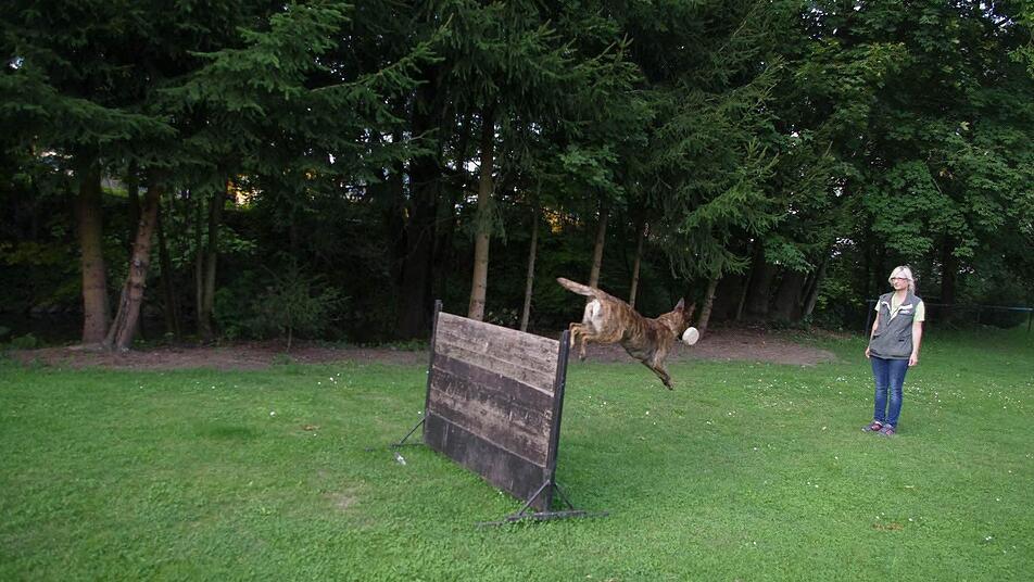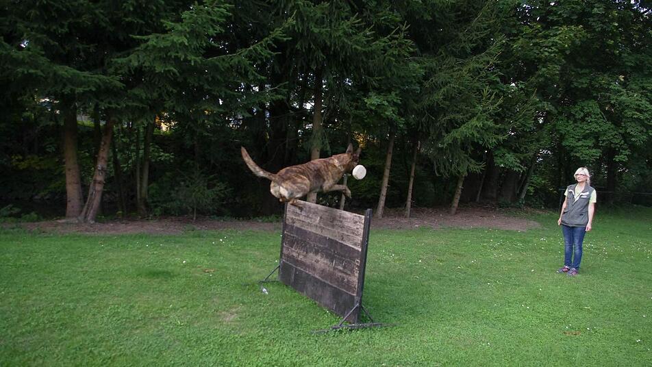 Konzentriert wartet "Fly aus dem Weserbergland" auf dem Gelände des Vereins für Hundefreunde (VdH) Kronach darauf, dass es endlich los geht. Der Holländische Schäferhund steht "wie eine Eins" neben seinem Frauchen Kathy Förtsch. Sein Blick geht zu ihr. "Hopp", gibt sie das Kommando. Mit fliegenden Ohren und hängender Zunge legt die Hündin los und springt über die ein Meter hohe Hürde. "Such", ruft jetzt ihr Frauchen. Fly apportiert das Bringholz, springt damit im Maul über das Springhindernis und bringt es ihrem Frauchen. Dafür gibt es ein dickes Lob.