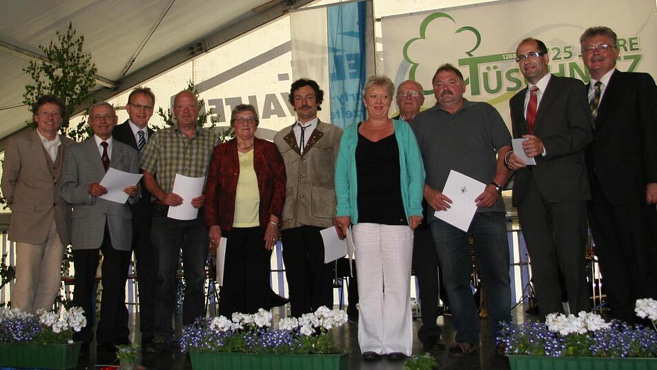 Auch Bürgermeister Herbert Schneider (parteilos) sowie die Vertreter der Vereine waren voll des Lobes. Dieter Wedel, der Vorsitzende des Vereins Tüschnitz aktiv, und Bernd Rebhan, der örtliche Beauftragte der Dorferneuerung, der auch die Festschrift erstellt hat, wurden ausgezeichnet. Auch die weiteren Aktiven der Dorferneuerung ehrte Bürgermeister Herbert Schneider.