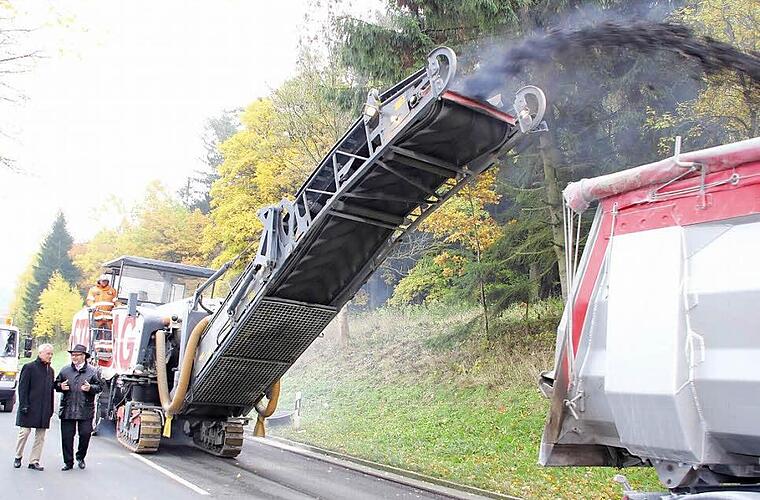 In der Ortsdurchfahrt wurden zehn Zentimeter der Asphaltschicht abgefräst. Da kommen in der kommenden Woche acht Zentimeter Binder und zwei Zentimeter "Flüsterasphalt" drauf.