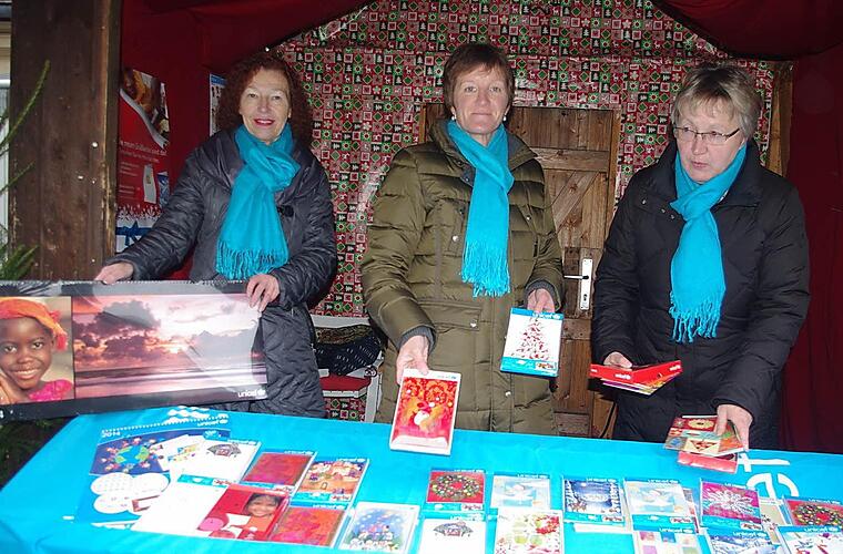 Liebevoll räumen Gisela Schardt, Gudrun Kättner und Christine Kropf den Unicef- Stand am Hussitenplatz auf dem Kronacher Weihnachtsmarkt ein. Sorgfältig platzieren sie Weihnachtskarten und Kalender mit den verschiedensten Motiven und in den unterschiedlichsten Formaten auf einem großen Tuch in Himmelblau, der Farbe von Unicef. Auch die Schals, die die ehrenamtlichen Mitarbeiterinnen um den Hals tragen, haben diese Farbe. "Das sind unsere Unicef-Schals", erklären die Frauen stolz.
