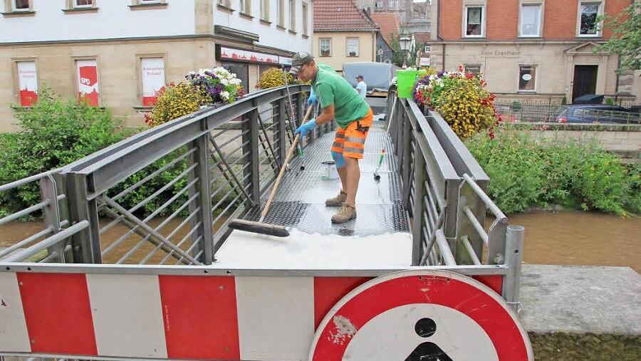 Ab heute wieder geöffnet ist der Eiserne Steg, der zwischen Adolf-Kolping-Straße und der Rosenau über die Haßlach führt. Am Freitag jedoch mussten sich einige Kronacher auf dem Weg in die Innenstadt eine andere Route suchen. "Wir wollten dafür sorgen, dass der Steg bei Nässe nicht rutschig ist", erläutert Wolfgang Günther.