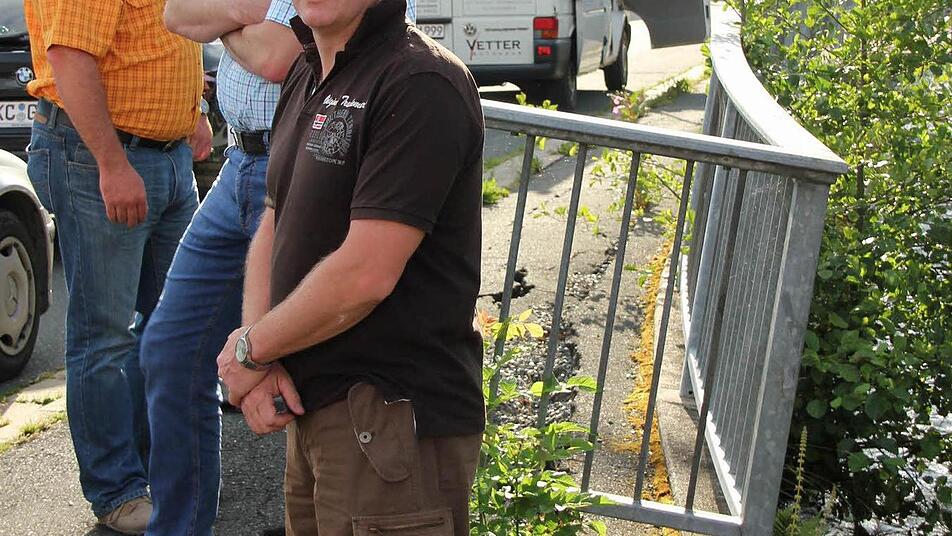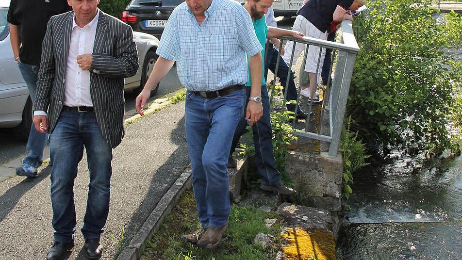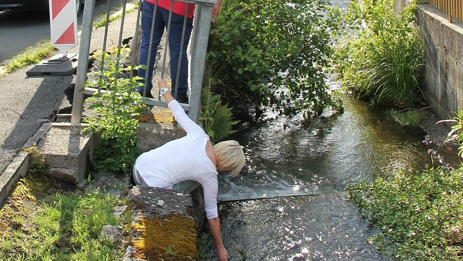 Sebastiansstraße und Bahnhofsstraße in Zeyern sind dringend sanierungsbedürftig. Die Mauersteine drohen, in den Bach zu fallen. Ursache ist, dass die Mauersteine auf einen Balken gesetzt sind. Der ist durch extremes Niedrigwasser trocken geworden und verrottet. Nun fällt die Mauer zusammen.