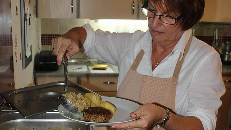 Ursula Gottmann richtet auf einem Teller Hackfleischklößchen mit Wirsing und Kartoffeln an. Jeden Donnerstag kocht die 62-Jährige in der Suppenküche des Diakonischen Werks Kronach-Ludwigsstadt/Michelau - und zwar ehrenamtlich.