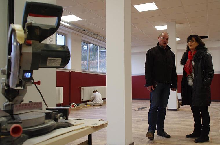 Zusammen mit Architekt Peter Kropf, der auch schon die Mitwitzer Montessori-Schule mit aus der Taufe gehoben hat, inspiziert Gudrun Jersch-Bittermann den Baufortschritt in Kronach. "Unsere Handwerksfirmen sind total zuverlässig", freut sie sich, dass es in den wenigen Wochen schon weit vorangegangen ist. Das Logo prangt an der Fassade, sein Rot und Grau findet sich längst an den Wänden im Innenbereich wieder. Einige Räume, wie die Mensa, wirken bereits jetzt fertig für den Schulbetrieb.