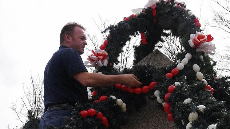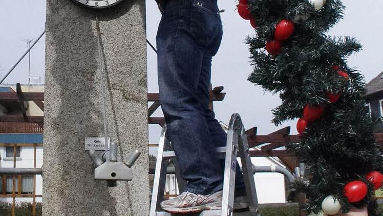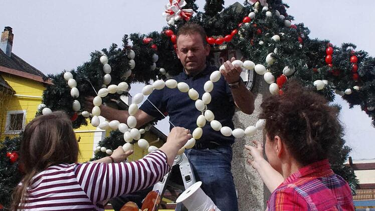 Bei Sonne und Schnee Das merkt der Betrachter auch bei den Arbeiten am Osterbrunnen. In einem Zug wird die Dekoration angebracht. Es sei natürlich eine Arbeit, mache aber auch Spaß, versichern Schirmer und Christel. Man habe auch schon im Schnee dekoriert erinnern sie sich bei diesmal frühlingshaftem Wetter.