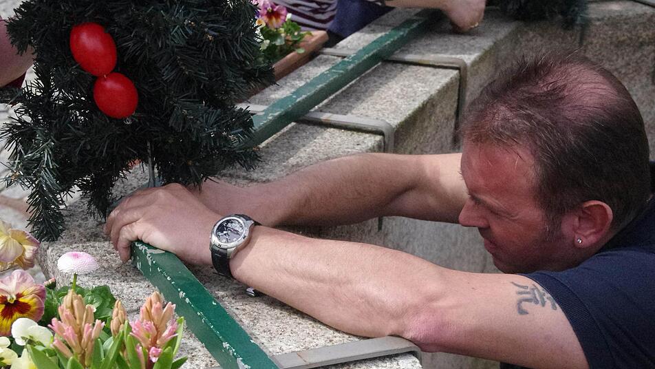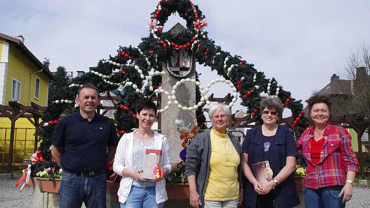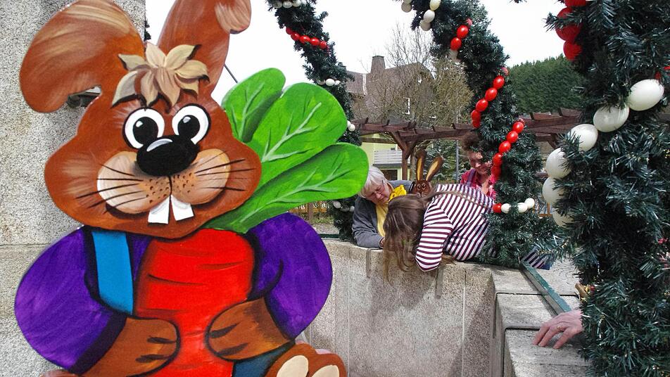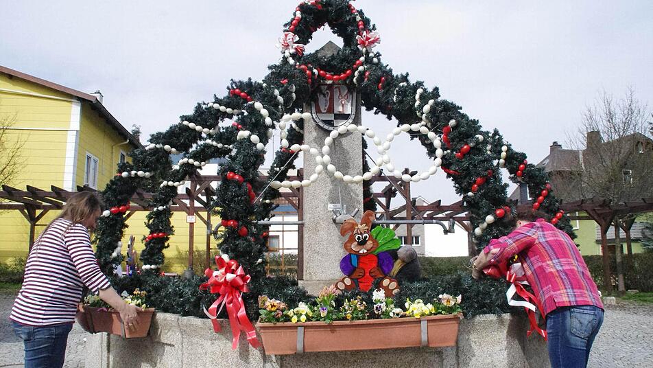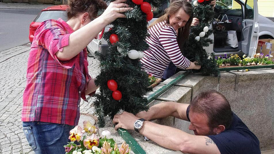 In Tettau putzten fleißige Hände den Brunnen in der Ortsmitte rechtzeitig zum Ostermarkt am Sonntag, 13. April, heraus. Zum 500. Jahrestag der Marktgemeinde wurde die Dekoration erneuert.