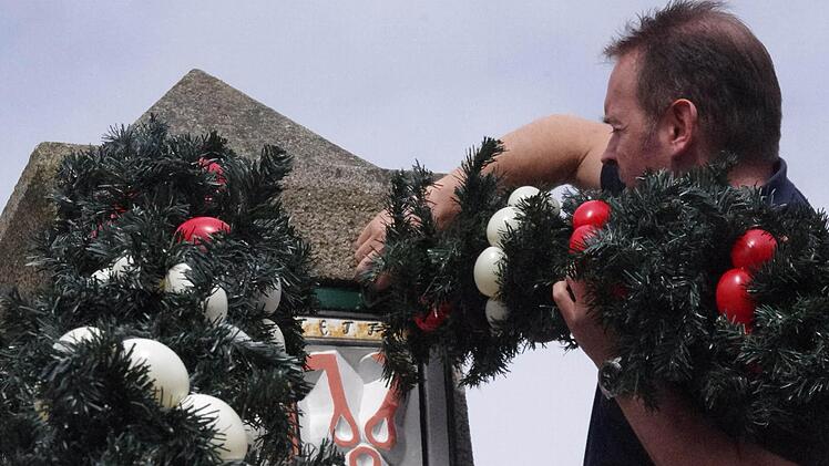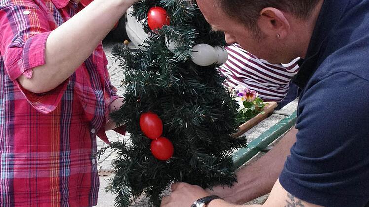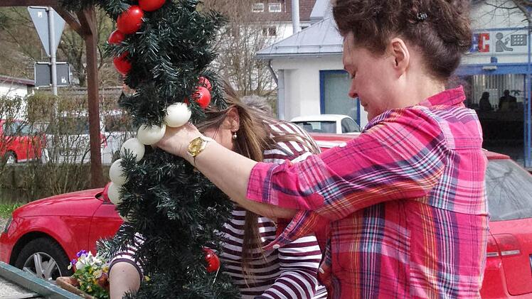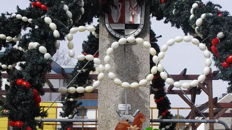 Für das Jubiläum der Marktgemeinde Tettau wollte man dem Brunnen heuer ein neues Gesicht verleihen. "Wir wollten mal was ganz anderes machen, nicht nur Girlanden und Schleifen", meint Anette Christel, während sie mit Thomas Schönhammer die "500" aus Plastikeiern unter der Brunnenkrone anbringt.