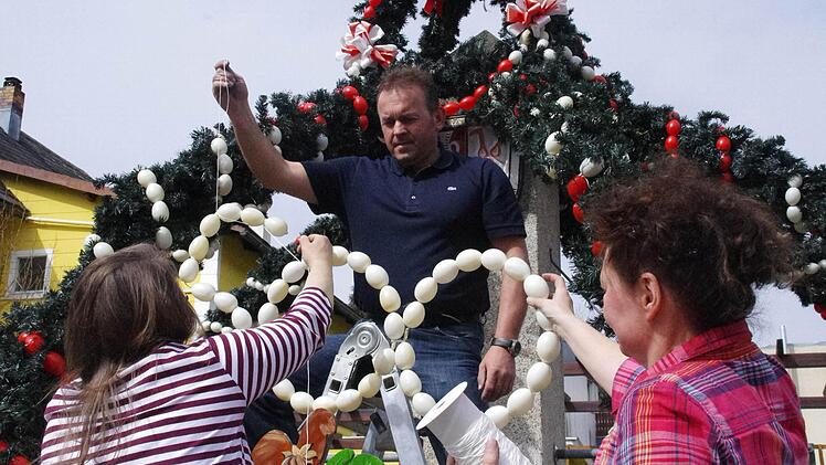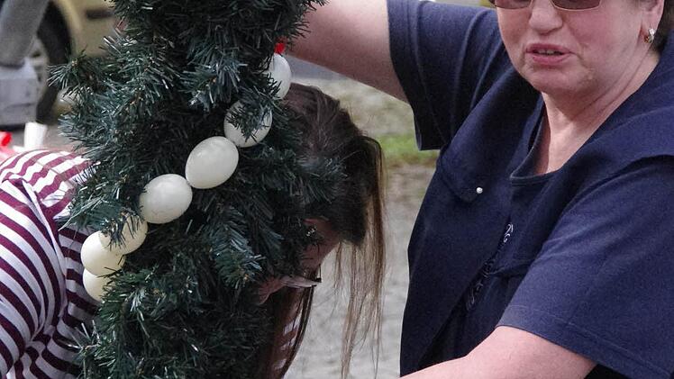 Die Eier an den Girlanden sind rot-weiß - die Tettauer Farben - ebenso wie die prächtigen Schleifen, die später angebracht werden. Für die Farbgebung war "die Uschi", Ursula Schirmer, zuständig, wie Christel erzählt.