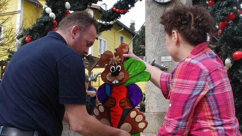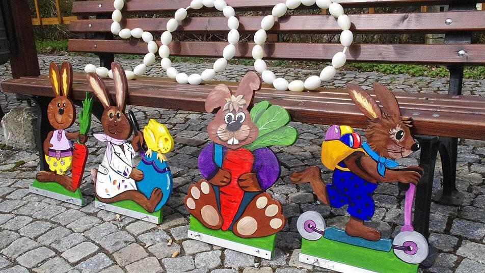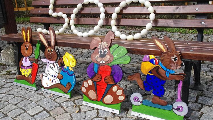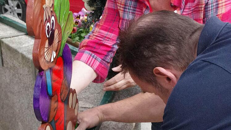 "In der ersten März-Woche haben wir mit den Vorbereitungen angefangen", erzählt Ursula Schirmer. Die Arbeit an den Hasen hatte jedoch schon viel früher begonnen. Jürgen Ehrhardt hatte sie ausgesägt. "Das ist ein Hobby meines Mannes", sagt Cäcilia Ehrhardt. Und Diana Schötz, eine gelernte Porzellanmalerin, hat den vier hölzernen Gesellen mit feinen Pinselstrichen ihr putziges Schmunzeln verpasst.