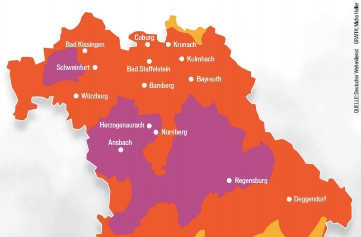 Kronach kratzt, und die lilafarbenen Flecken in der Mitte Bayerns sind allerdings keine Hinweise auf eine Sturmfront oder auf große Gewitterzellen. Der Deutsche Wetterdienst weißt damit auf seiner Homepage auf die Waldbrandgefahr hin. Und die ist angesichts der frühsommerlichen Hitze und Trockenheit akut.