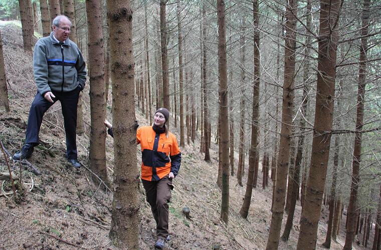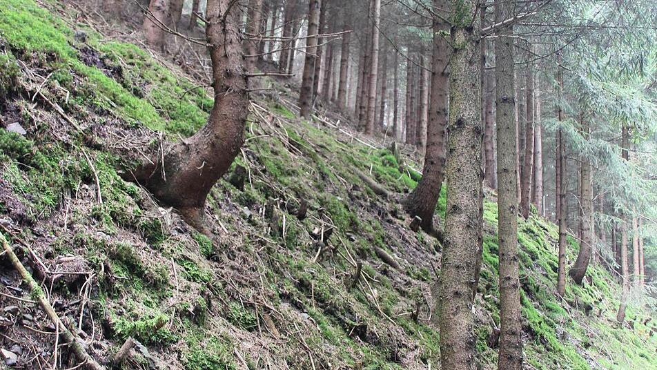 Beispielsweise am Spitzberg bei Neukenroth. Der Hügel hat seinen Namen nicht von ungefähr. Die Waldwirtschaftswege am extremen Steilhang mit etwa 80 Prozent Gefälle liegen zu weit auseinander, so dass Michael Schneider einen etwa einen Kilometer langen Rückeweg bauen lassen will. Die Neukenrother Waldbesitzer hat Nancy Koller schon von der Notwendigkeit des Wegebaus überzeugt. Die aus Eila muss sie noch gewinnen, aber da die auch vom neuen Weg profitieren, wird ihr das mit ihrem Charme sicherlich gelingen. Es ist nach Ansicht des Forstdirektors nötig, dass sich am Spitzberg bei Neukenroth etwas tut, denn der Hang rutscht ab, was sich am Säbelwuchs mancher Fichten zeigt.