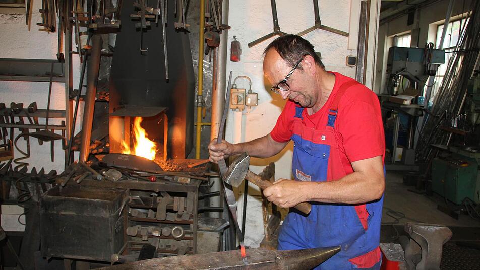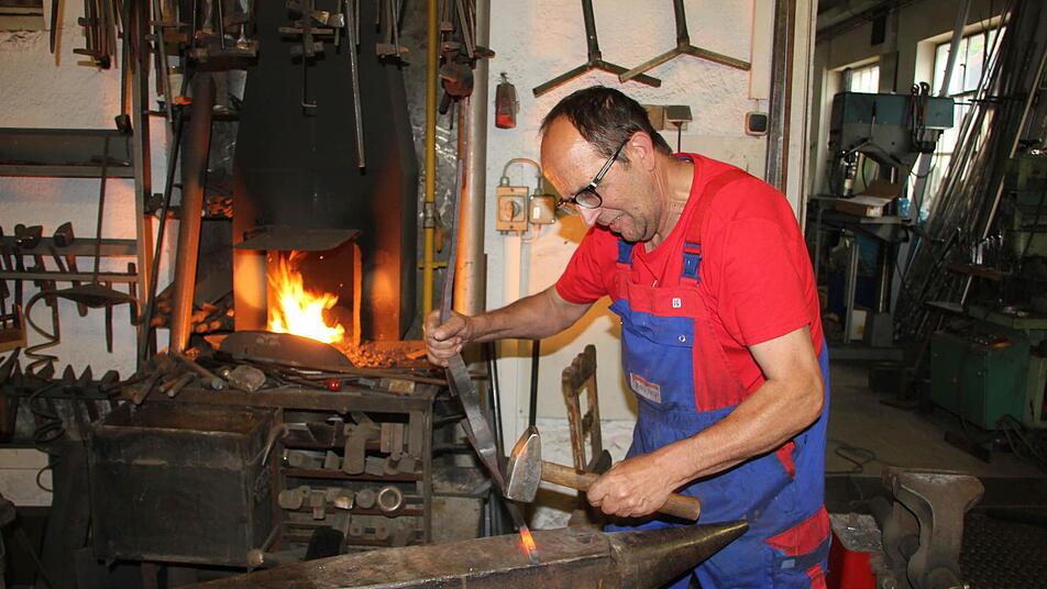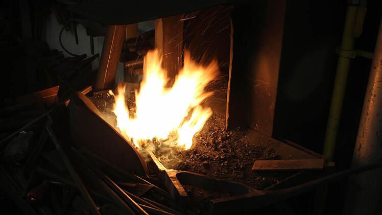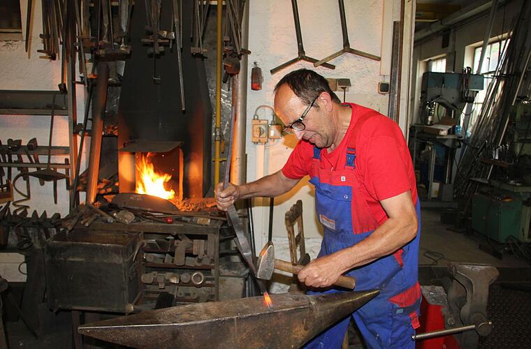 "Am liebsten mache ich Strichmännchen", sagt Metallgestalter Andreas Behrschmidt und hämmert auf ein glühendes Stück Eisen ein. Immer wieder saust der 1200 Gramm schwere Schlosserhammer auf das Werkstück, das auf dem Amboss liegt, herunter. Kaum zu glauben, dass aus dem Stück Metall, das von einem Doppel-T-Träger abgeschnitten wurde, ein Strichmännchen werden soll. Wird es aber - durch die Handwerkskunst des 58-jährigen Wallenfelsers.