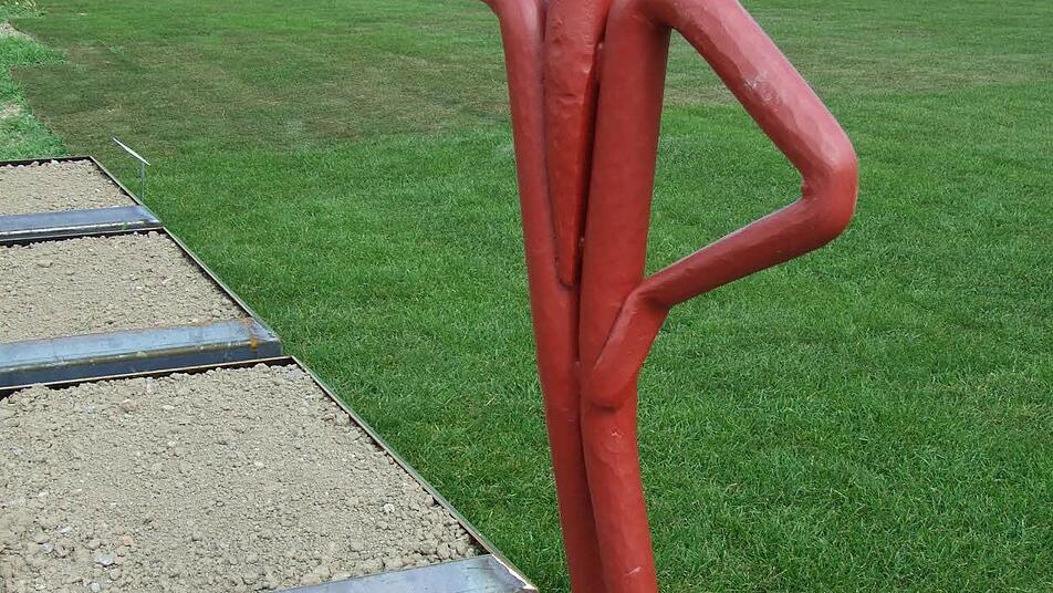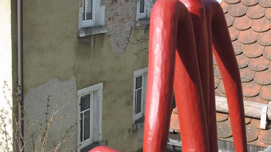 Jedoch waren die Figuren aus Schmiedebronze für eine Outdoor-Präsentation zu klein. Kein Problem für den Metallgestalter. Der "vergrößerte" seine Schmiedebronze-Figuren im Maßstab 1:4, allerdings sind die großen Männer aus 50 bis 60 Millimeter starkem Rundstahl, der verzinkt und rot lackiert ist. Das Figuren-Quartett unter dem Tenor "ausgereizt"symbolisiert, was passiert, wenn der Mensch über seine Grenzen hinausgeht. Die erste Figur schaut neugierig nach oben, die zweite klettert eine Glaswand hinauf, die dritte sitzt keck oben auf dem Rand, aber die vierte stürzt ab. Die vier Figuren haben Gesichter in unterschiedlichen Farben. Das erste ist hautfarben, das zweite grün, das dritte gelb und das vierte rot. So wird die Gefahr für den Menschen, wenn er über seine Grenzen hinausgeht, symbolisiert.