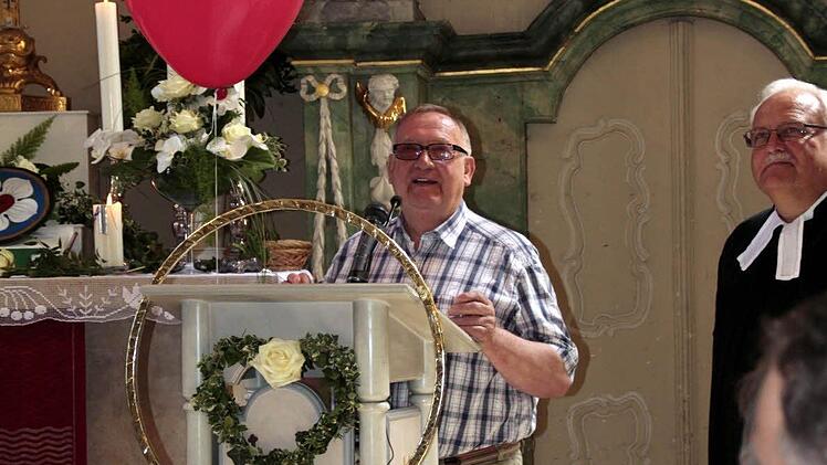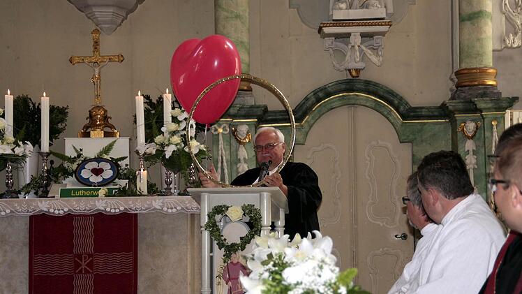 Im Zentrum ein schwarzes Kreuz im roten Herzen, dass verdeutlicht, so Taeger, dass allein der Glaube an den Gekreuzigten selig machen kann. Mit einem roten Herzluftballon machte sich Prädikant Thomas Rebhan an das Rednerpult auf, um seine Gedanken zum roten Herz beizutragen. In der Symbolik steht, dass wenn "man von Herzen glaubt, wird man gerecht" als ein Grundpfeiler des christlichen Glaubens, so Rebhan.