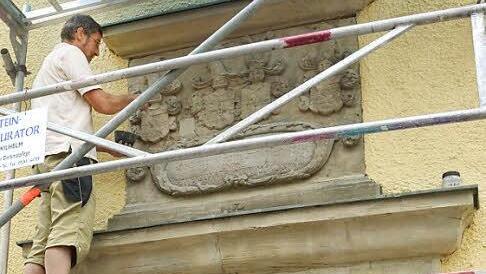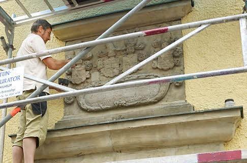 Nach schon durchgeführten Maßnahmen konnte nun auch der Wappenstein am Westportal der Kirche restauriert werden. Für die Restaurierung gewann Heinz Kraus den mit solchen Maßnahmen vertrauten und bekannten Steintechniker, Restaurator und Meister im Steinmetz-und Steinbildhauerhandwerk, Wilhelm Keim aus Roßlach.